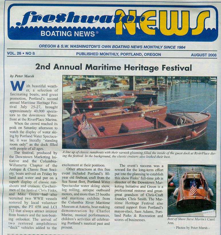 Mentioned in August 2008 Freshwater News article on Maritime Heritage Festival